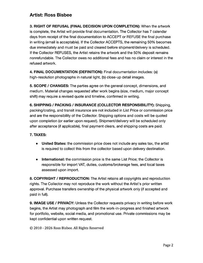 I believe it is important to avoid ambiguity and misunderstanding, by establishing a good framework whereby both myself, the Artist, and you, the Collector, have a clear understanding of expectations and responsibilities.